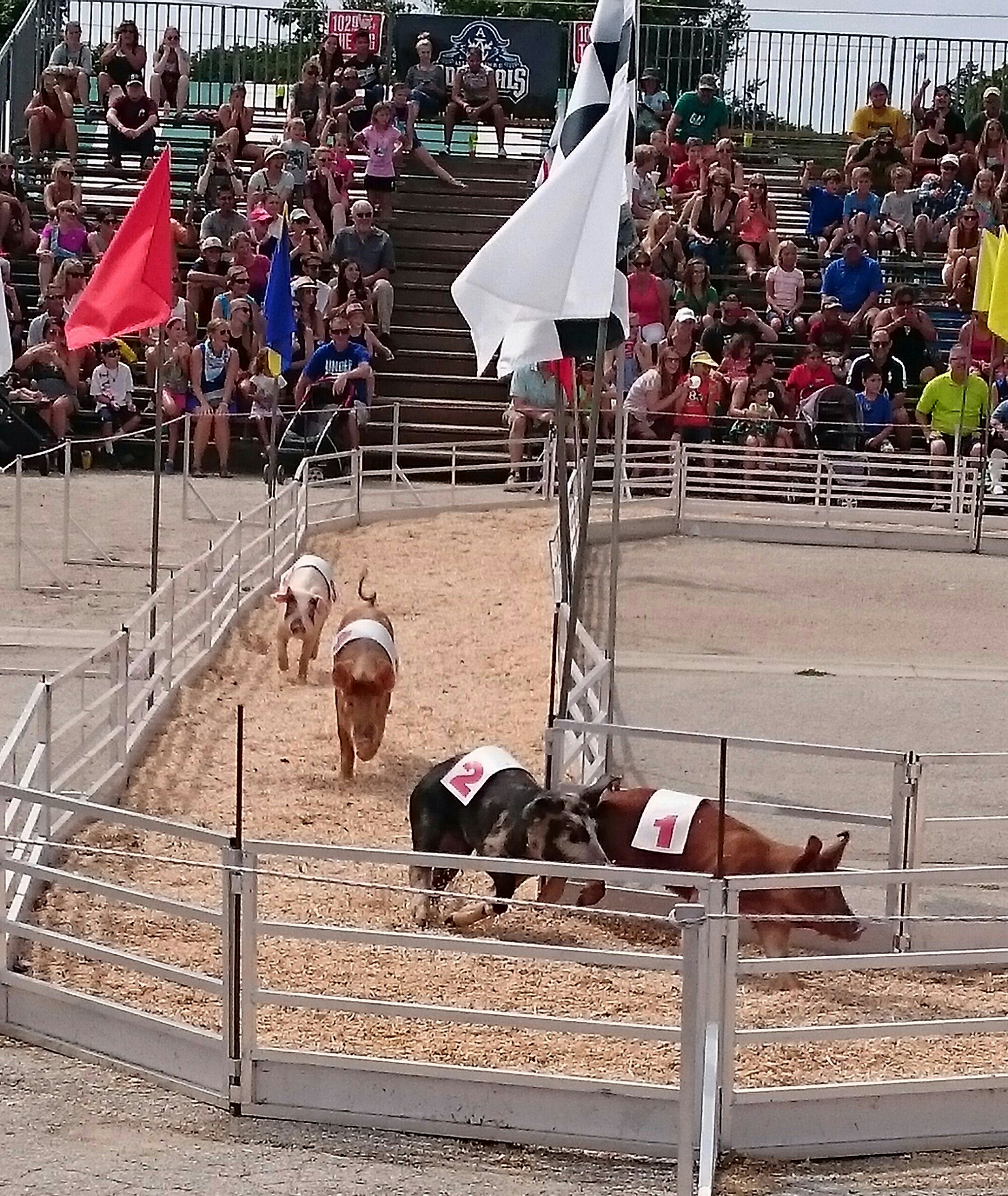 In the picture above they have been put in a ring with some sashes on and are racing around a track for an Oreo cookie. People stand and scream and cheer for a winner. They high-five each other if their pig wins. They even buy little pig souvenirs. Here is the funny thing, most of them never go into the barn where the regular pigs are. What is the difference between these two pigs? One has a cookie at the other end and a little bit of training.
