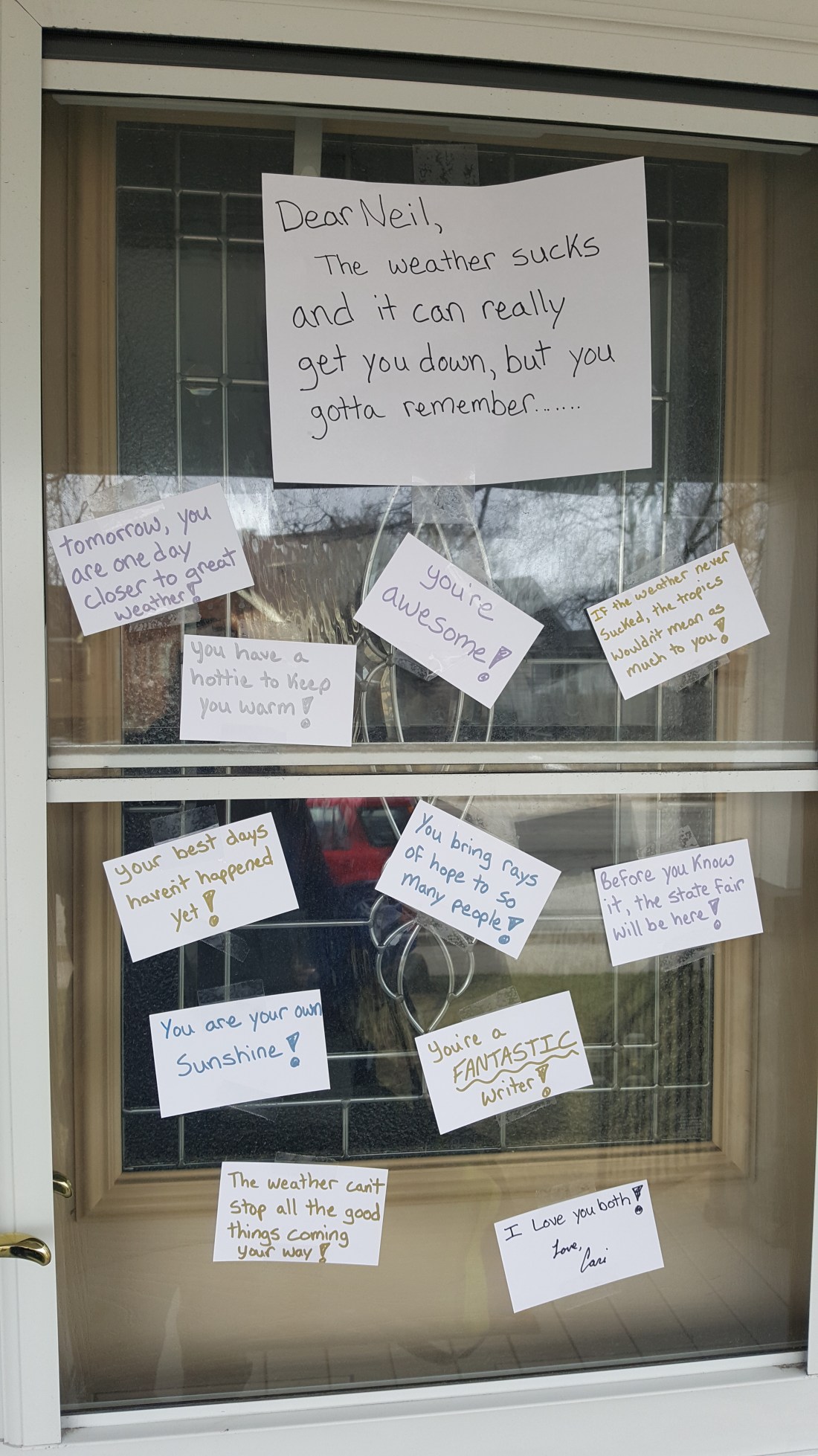 When we arrived home around 2 a.m., after what was a very busy evening I was exhausted. Currently, the date here is January 95th, or so it feels. We should be having highs in the mid 50’s but they had been barely above freezing with the sun so fed up with the long winter it decided to take a vacation. I have Seasonal Affective Disorder, so prolonged cold weather minus the sunshine can be quite trying for me and those around me. At this point if you would like to light a candle for Margie it would not be a bad idea. Because I do indeed trust my friends with this information and share it with them as well, Cari was able to do something so thoughtful and amazing. I arrived home to see the above signs taped to my front door! They ranged from reminding me warm weather was coming, to the fact that the cold weather is what makes the tropics so special to me. She added the Wisconsin State Fair, which I love as well. She even encouraged me by reminding me how much my writing touches her and others.