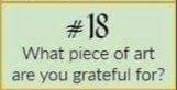 What art are you grateful for? In my life I have learned that there are so many things that are art. When I order a Chai latte at the local coffee shop, my friends Curtis and Danie create a masterpiece. When I visit West Allis Cheese and Sausage shop owned by my friend Mark, the dishes I am served are works of art. I have friends who cut hair that are great artists. I am grateful for all of these! Is there an artist you know that has created something you are grateful for?