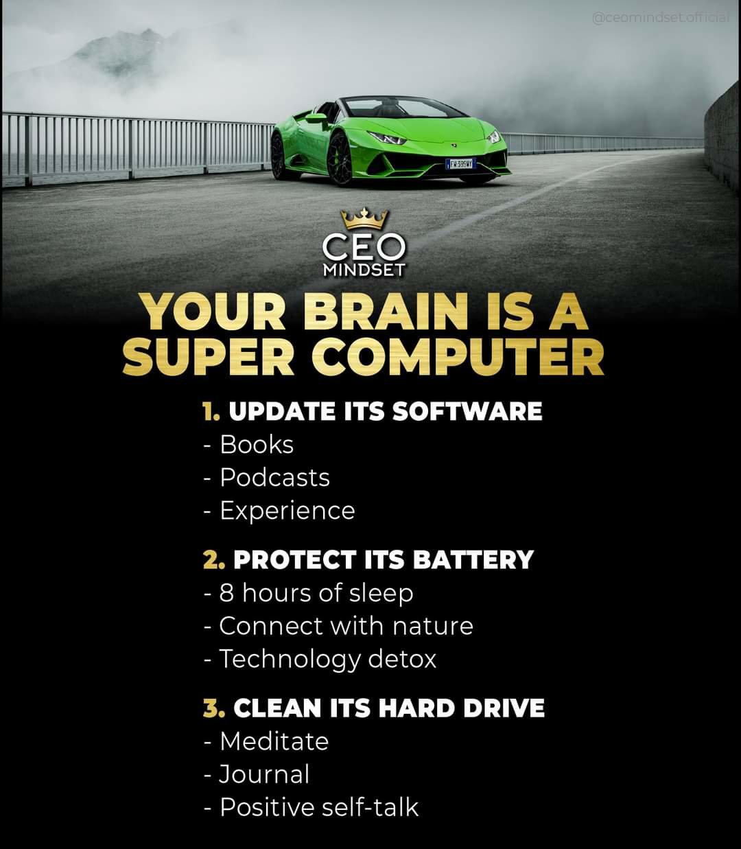 Many times, changing the way we view certain things can benefit us greatly. I have often spoke about viewing your life as a business and the benefits that can have. I think this picture above, comparing your brain to a computer, can be very helpful as well. Most of us are guilty of treating our computers better than our brains at times. If you find it hard to find the motivation to read and educate yourself, just think of it as updating your software. This even sounds fun. Imagine telling your friend, “Sorry Bob, I would like to hang out tonight but I am updating my software.” Bob may think you’re crazy, but it doesn’t change the fact that this is a good way to look at filling your mind with healthy and positive material.