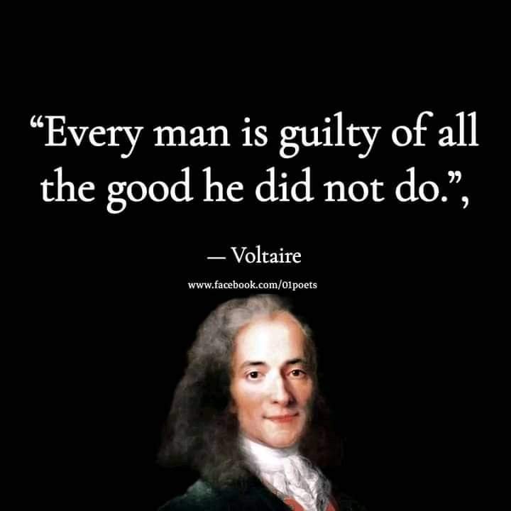This post may be a little uncomfortable. For you, for me and for many of us. Many of us consider a life where we try to limit the hurtful and bad things we do, to be a good life. To some extent, this is true. Trying to do as few things to hurt your fellow man certainly makes the world a better place. Is it really enough? Voltaire reminds us in the quote above, that if we know of a good we could have done, but did not, we are guilty. Has there been a time when you know there was something good you could have done but did not? Maybe you did not have the time? Maybe you lacked the energy? Were you too nervous? Perhaps a little too shy? These are all true and valid reasons. Yet, if we deny some good to the world or our fellow humans, we are guilty as charged.