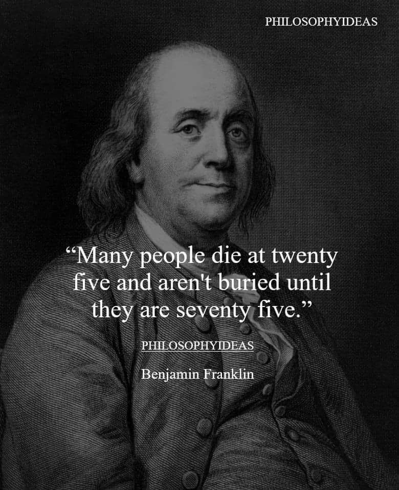 I have always liked this quote by Ben Franklin. Yes, we are on an informal basis like that. Actually, Ol’ Ben was quite a party animal, but that is a post for a different day. What does he mean about Dying at twenty and not being buried until we are seventy five? Does that mean they leave us out long past our shelf life? No. What it means is that we stop living a life of purpose and passion and settle into a life of mediocrity. It is the “Wake up, pay bills and die.” mentality.
