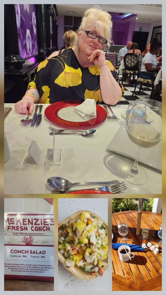 Above are just a few examples of some amazing dining experiences I have had. There was a picture of my lovely lady waiting for a meal on our second trip to Jamaica. There is also a conch salad we had in the Bahamas. It was very fresh and we watched the man prepare it on the spot for us. Margie, however, thought it was like attempting to eat a super ball. I must say she was not entirely incorrect in her assertation. The final picture was of a breakfast we shared while on vacation. As you can see, tasting new dishes in different places is just part of the fun of exploring the world with the woman I love.