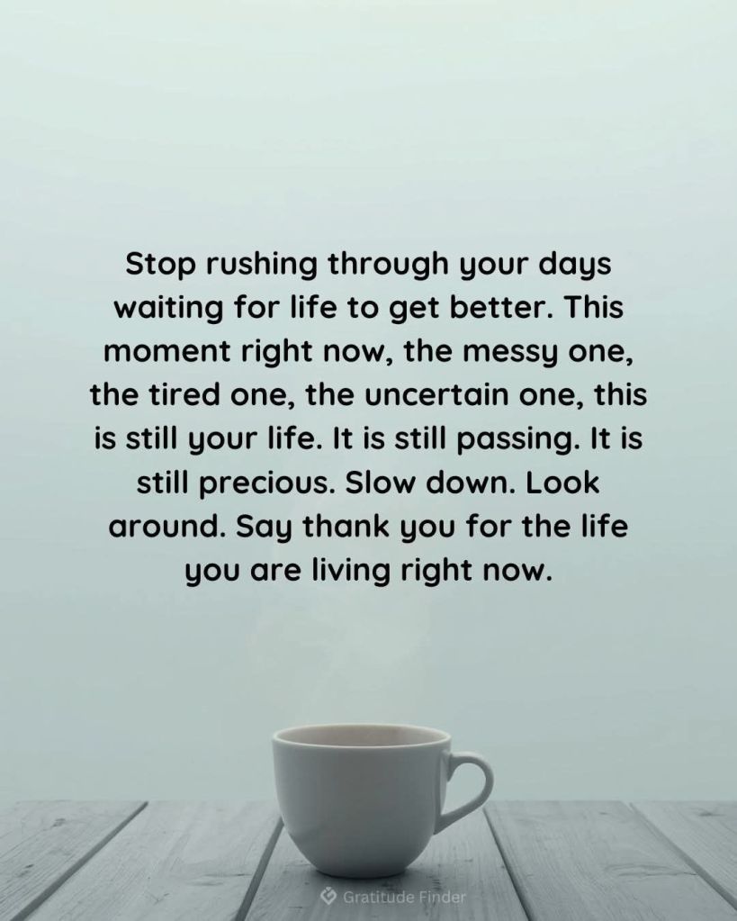 While it is healthy to pursue continual self-improvement, you do not have to be unhappy with your current state. Yes, things may not be as you wish they were, but there is beauty in that too. The hard days help us not to take the good days for granted. The challenges we go through along the way will help us enjoy the destination that much more. Life has a way of passing by in the blink of an eye. If we delay enjoying it until we reach some finish line, we may find we never get to enjoy it at all.