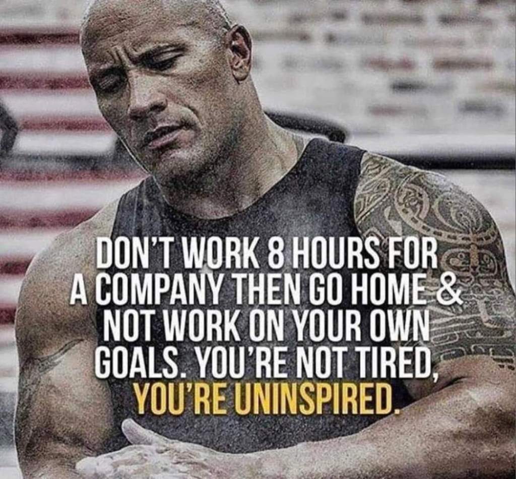 I am not advocating sleeping 2 hours, working 9 and then hiking 2.3 miles. When it comes to my life, I would not recommend following my sleeping habits at all. What I cannot recommend strongly enough is to make sure you devote a portion of your life to your goals and dreams. Do not only do it when you find yourself with ‘extra time’. Do not wait until you are well rested. Do not wait until you have a day off, or finally take your vacation. Like the picture above says, do not work 8 hours for a company and then go home and not work on your goals. You will be amazed at the energy working on something that feeds your passion will give you. Plus, who would want to argue with The Rock?