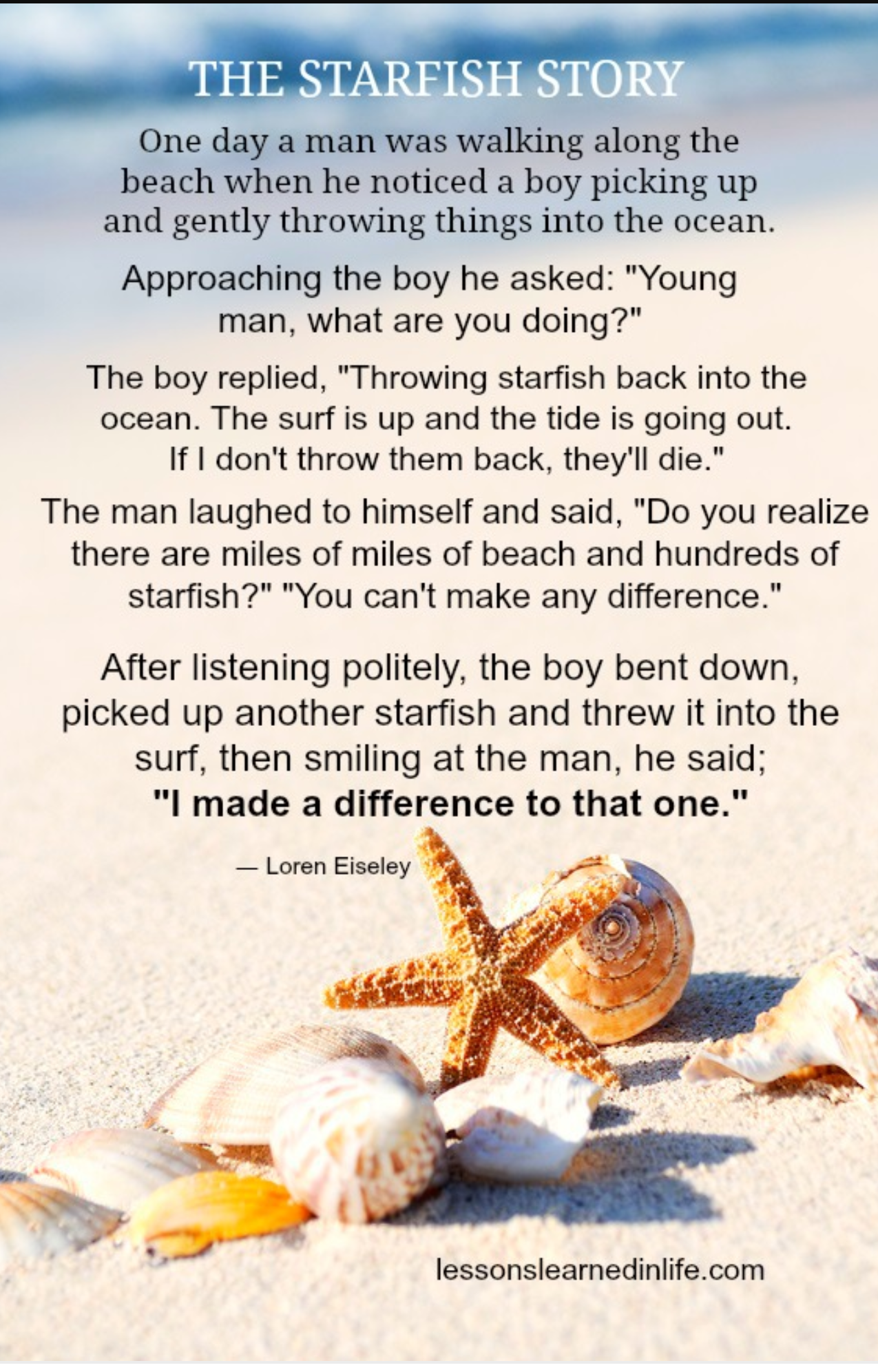 Another aspect of helping that one person we must keep in mind is the ripple effect. By inspiring, helping or saving one person, you never know what they may go on to do for others. It is like the movie It’s a Wonderful Life. We not be able to see what the world would have been like if we had not been there, but rest assured you make a difference.