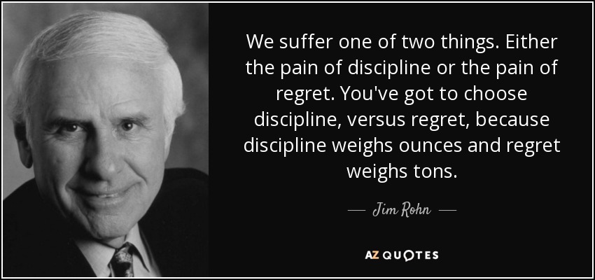 We may think staying in bed or eating that doughnut is the ‘easy’ or ‘painless’ solution. It might be at the time. What we must realize is that everything has a cost. What may seem difficult in the moment, the pain of discipline, will make our life easier in the long run. What seems like ‘giving in’ or the easy solution, will cost us much more in the end. That is the pain of regret. As Mr. Rohn pointed out, discipline weighs ounces, regret weighs tons. Think of what pain you are suffering.