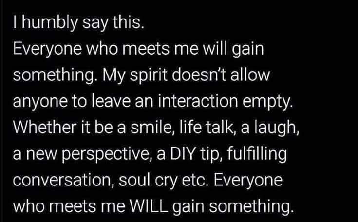 We touched on this a little in the last post. We should endeavor to bring something to the lives of everyone we touch. It could be just lending an ear to someone who never feels heard. One of the best things we can do these days is offer an uplifting and encouraging message to everyone. The world seems in dire need of such things. There are few universal truths in the world. I think wanting to bring something to the life of everyone we meet is one of them.