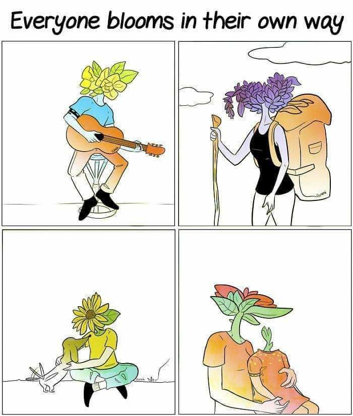 Another great example of a picture is worth 1000 words. I will do my best to expand on this picture and keep the word count below 1000. Everyone blooms in their own way reads the caption of the photo. Represented here is someone playing music, someone walking in nature, someone being greeted by a dog and lastly, it appears and adult holding a child. Each of these experiences are causing that person to bloom. What exactly does that mean? I interpret blooming to mean allowing more of themselves to show. Having the self-confidence or happiness to cause us to reveal more of our true nature to the world.