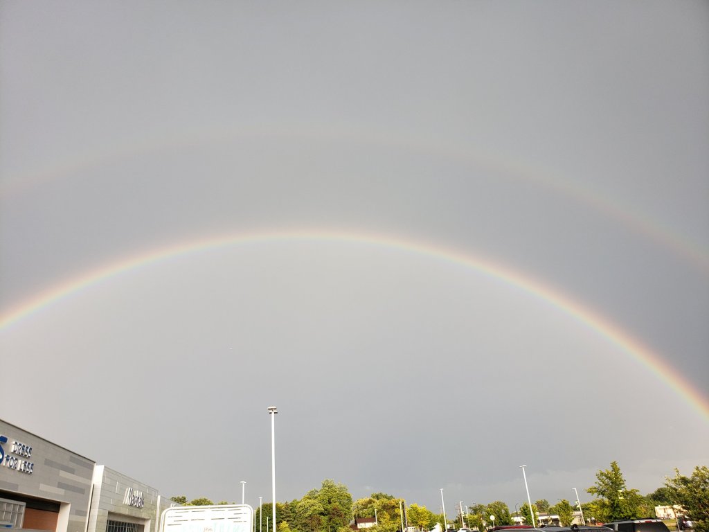 I also love grocery shopping when I am in a funk. For some reason, that seems to lift my spirits. My mother and I had been meaning to stop by this small grocery store for a few months and both decided that this day would be a good one to do so. On the drive there is was raining and traffic was understandably slow due to the weather. No sunshine was to be had. It seemed even a trip to one of my favorite stores would be a trying journey. As we shopped, I did my best to be in the moment. I looked for fun new items to put into the cart to bring home to Margie for us to try. Slowly, the funk of the last 2 days lifted. I pushed the cart out of the store hoping the rain was not too bad. To my surprise, I saw the image above – a double rainbow! The mood started to lift even more. We stopped to take several pictures; as you can see. That had us feeling a little more cheery.